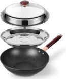 - Non-stick & Easy Cleaning: The woks and stir fry pans nonstick with a lid to adopt stone coating and carbon steel which are free of PTEE and , allow you to cook with LESS oil or butter. Less lampblack, more healthy. Cleans up easily, dishwasher safe (hand wash is recommended). Don’t need seasoning before use.