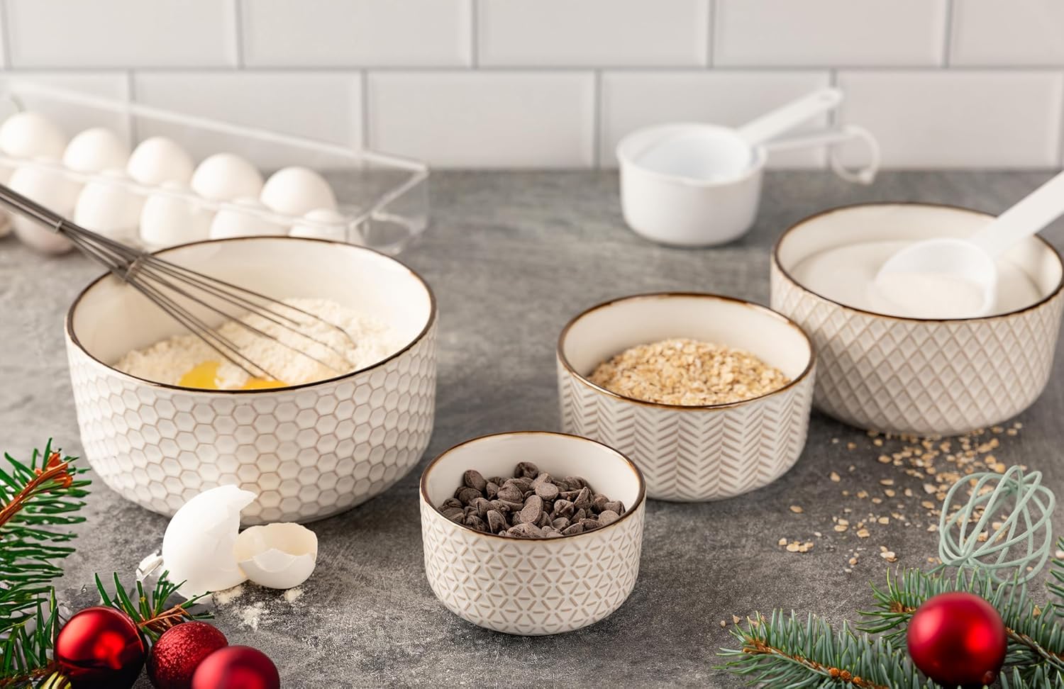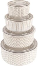 - Collection: Made from durable and glossy cream stoneware that’s safe for the dishwasher. The set includes 10.1/ 16.9 / 29 / 47 oz bowls. Each is embossed with a geometric pattern and finished with gold accents