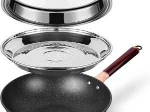 12.5” Woks & Stir-Fry Pans with Lid Steamer, Nonstick Ceramic Wok Pan with Lid, Deep Large Induction Hard Anodized Frying Wok, Carbon Steel Wok Set Flat Bottom, Large Saute Pan Set